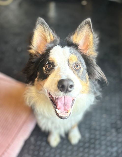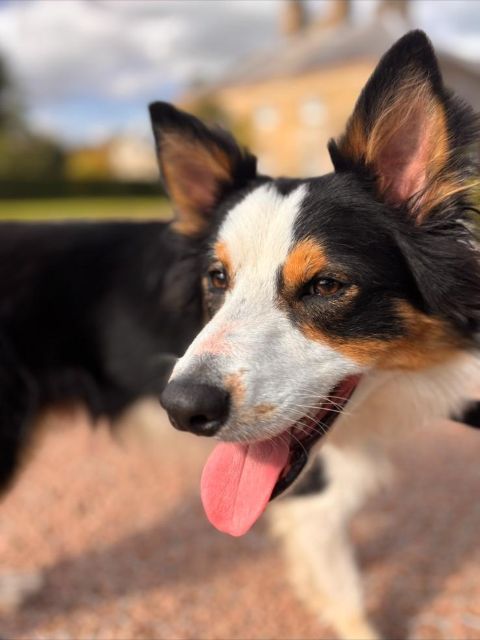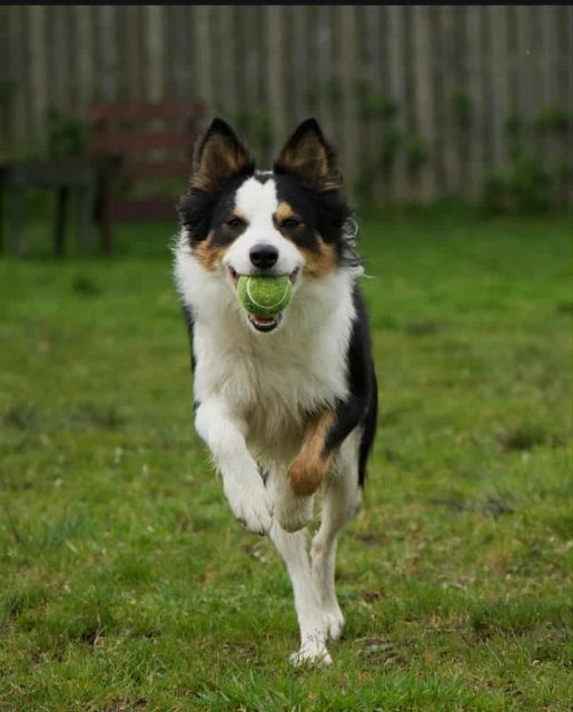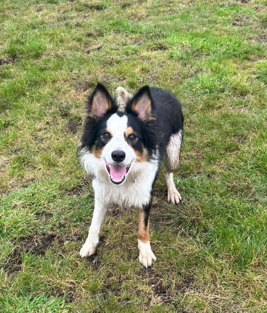 He plays well in the arena and loves to chase a ball but he is an extremely affectionate dog who would gaze into your eyes for hours. That being said, he is a typical Border Collie and is very high energy. Although he now walks on the lead without spinning he does pull and would need some work on that.