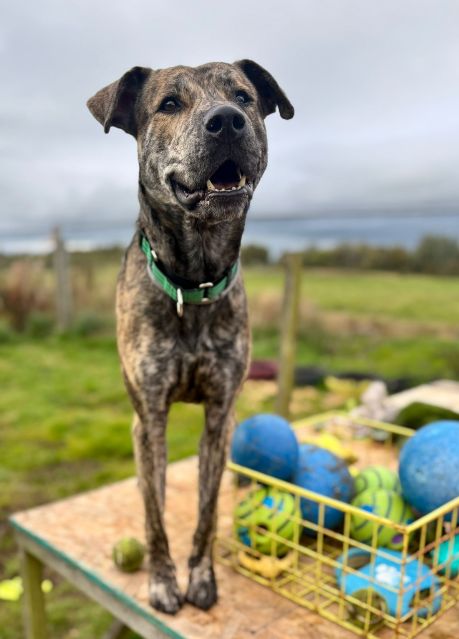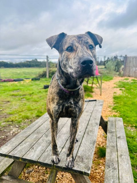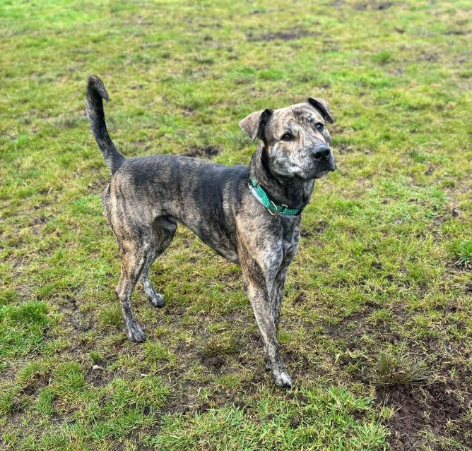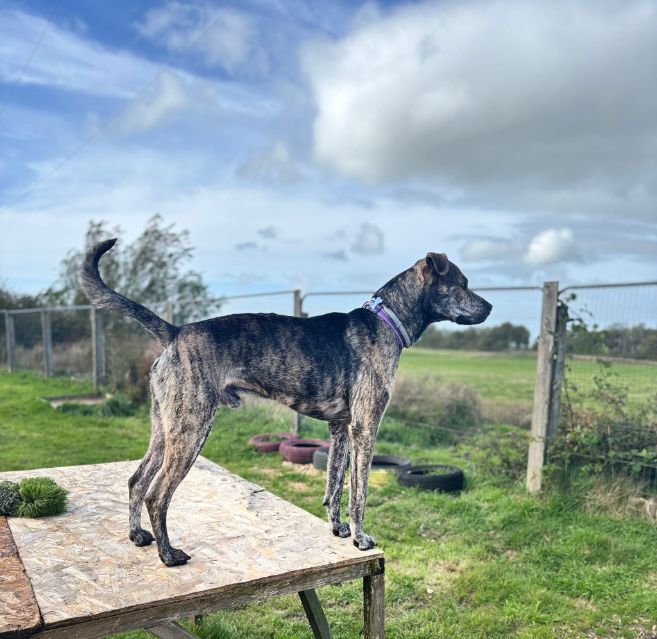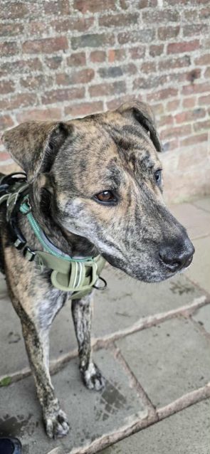 Since being here he has been a star!! His left eye is slightly smaller than his right and he seems to have a little sight impairment but that doesn't hold him back. He is a tall boy! He is also immaculately clean in his kennel therefore we are confident he is house trained.